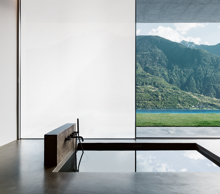 «Switch» ermöglicht mithilfe eines Stromimpulses den Wechsel zwischen transparent und blickdicht oder die Aktivierung des Sonnenschutzes, der den Wärmeeintrag ins Gebäude steuert. Das funktioniert bei Fest- und Schiebeelementen, in jeder Position, sogar während des Schiebens. Die Kabelführung ist unsichtbar. sky-frame.com