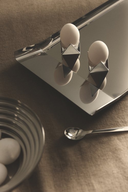 2. Das Edelstahltablett «Arran» von Enzo Mari bereitet eine schillernde Plattform für die Eierbecher «Roost». alessi.com