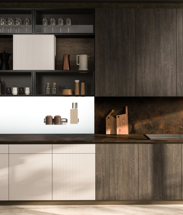 3. «Bijou» zeigt sich im neuen Finish. Herzstück der Küche sind die geriffelten Glastüren. Die glänzenden Oberflächen und die elegante Transparenz des geriffelten Glases verschmelzen nahtlos miteinander und schaffen eine Atmosphäre von Luxus und Raffinesse. arancucine.it