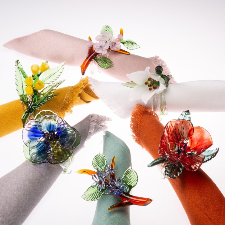 9. Die Kollektion «Jardin Fleuri» wird um eine neue Serie von Serviettenringen erweitert – sechs zarte, handgefertigte Kreationen aus farbigem Glas. Jede Blume wird von einem Meisterglasbläser von Hand modelliert, wobei traditionelle Techniken mit einem raffinierten Sinn für Form und Farbe kombiniert werden. casarialto.com